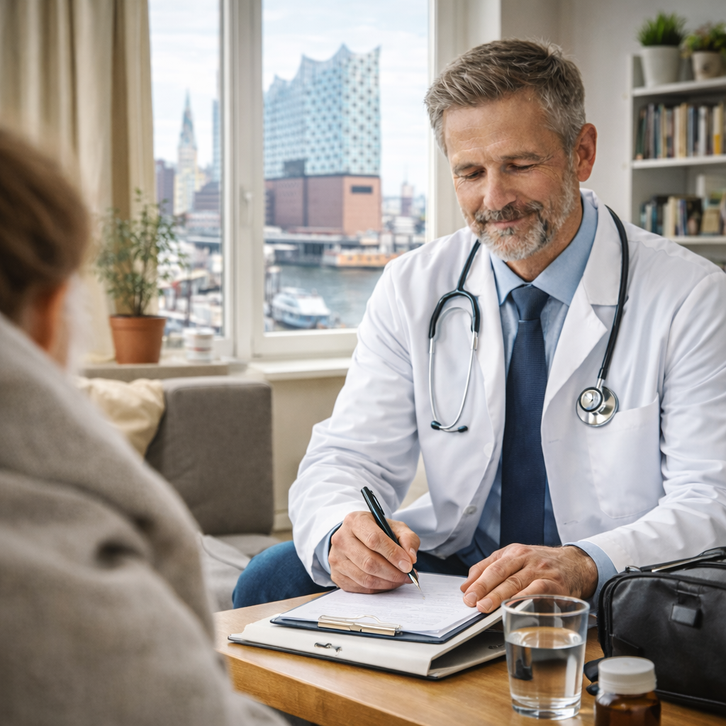 If medically indicated, a sick note in Hamburg can be issued during the consultation. This option is frequently chosen by business travelers, families with children, elderly patients, or individuals experiencing significant weakness.